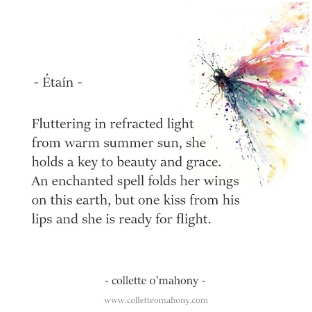 Étaín is derived from a diminutive form of an old Irish word for passion or jealousy. When Midir, an elder of the Tuatha Dé Danann ( Celtic pantheon of gods) falls for Étaín, he marries her much to the ire of his rejected first wife. In her jealous rage, she casts a spell on Étaín.turning her into a beautiful scarlet fly. Midir is unaware of the enchantment on his beautiful young bride. The magical winged creature becomes his constant companion and he loses all interest in other women.